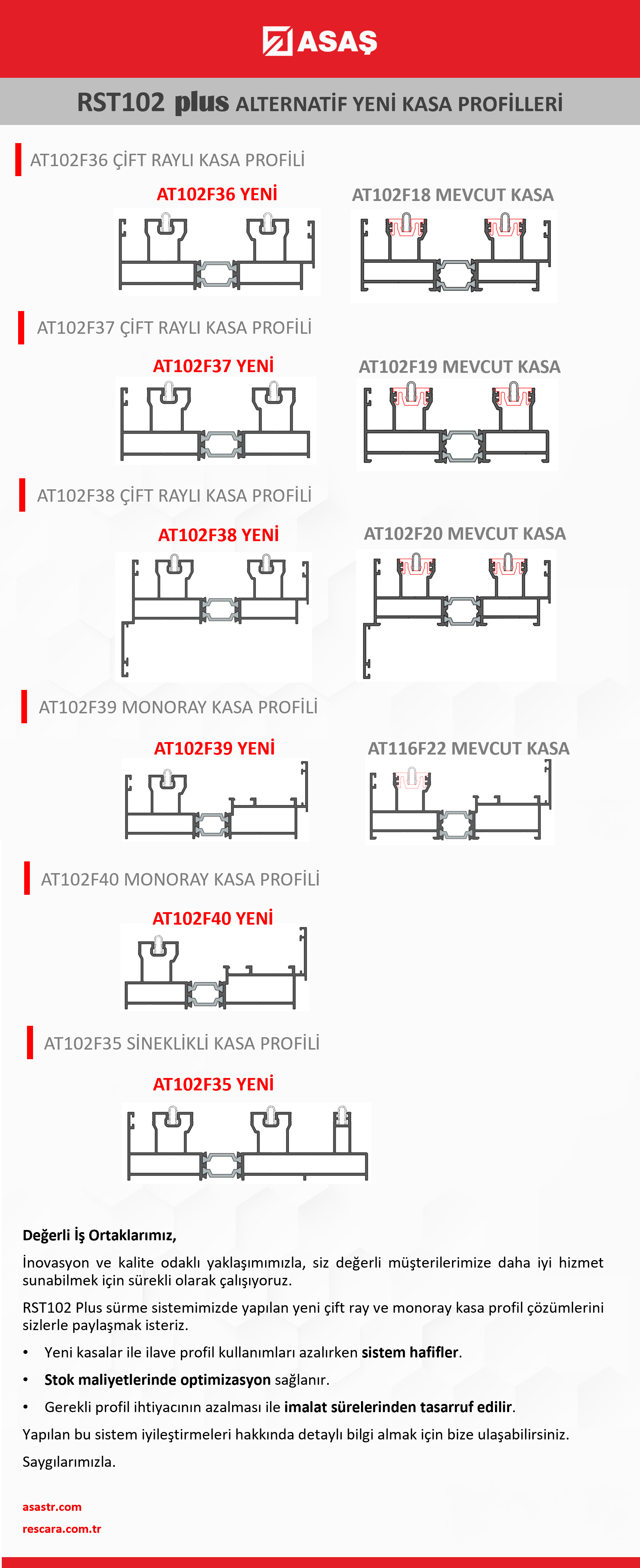 RST102 Plus Alternatif Yeni Kasa Profil Çözümleri RST102 Plus sürme sistemimizde yapılan yeni çift ray ve monoray kasa profil çözümleriyle ilave profil kullanımları azalırken sistem hafifler, stok maliyetlerinde optimizasyon sağlanır, gerekli profil ihtiyacının azalması ile imalat sürelerinden tasarruf edilir.